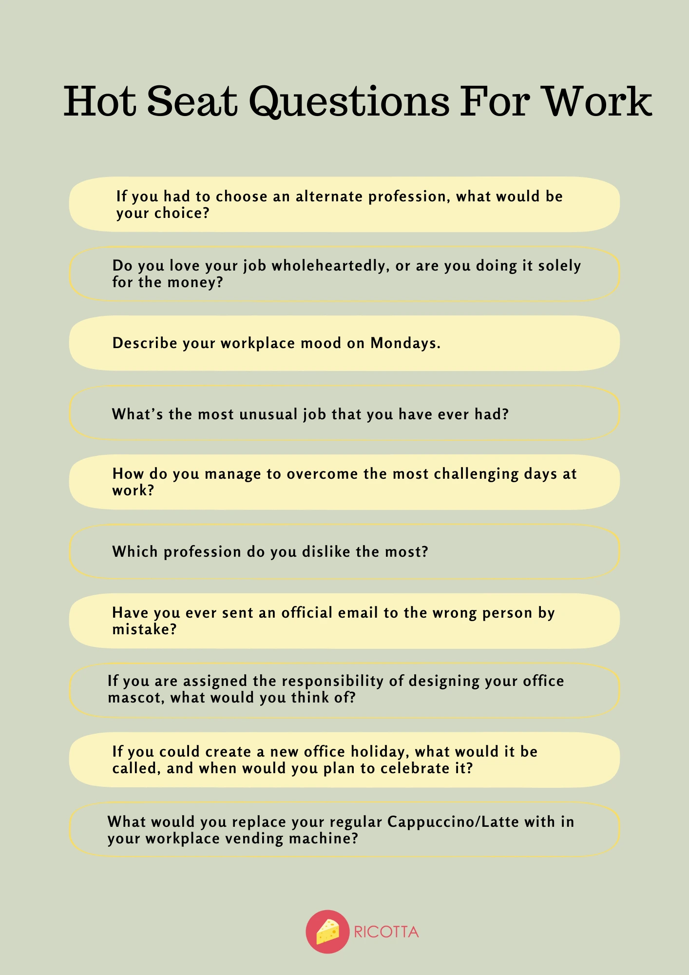 Use hot seat questions at work as icebreakers or team-building activities. Pick workplace-friendly prompts like “What’s your favorite office snack?” or “If you could work anywhere in the world, where would it be?” They help colleagues bond, ease stress, and make meetings or virtual calls more engaging.